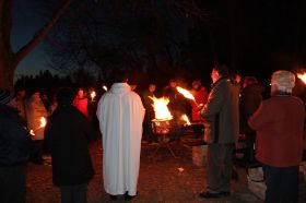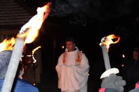 Nach der Fackelwanderung zur Kapelle wird vom Pfarrer am Lagerfeuer eine kleine Predigt gehalten